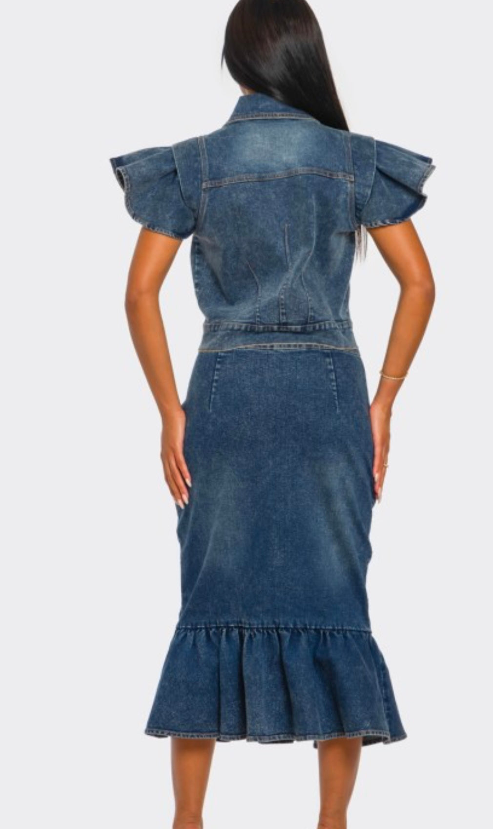 This isn’t your everyday denim — this is power dressing with softness. The architectural ruffle sleeves command attention, while the tailored bodice and precision seaming sculpt a refined silhouette.